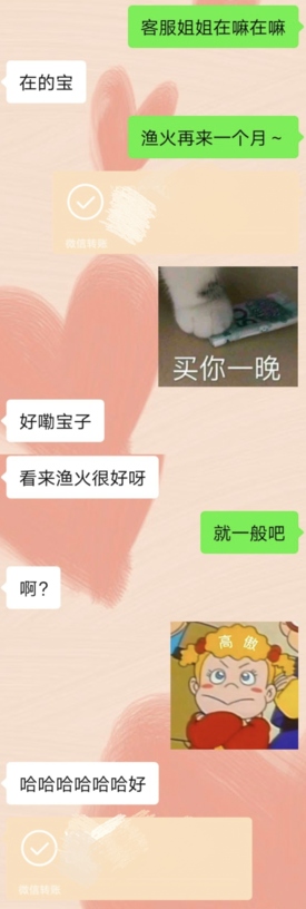 最初购买监督服务,温浅抱着尝试的心态买了一个月,结果出乎意料,她很享受,她很喜欢渔火。