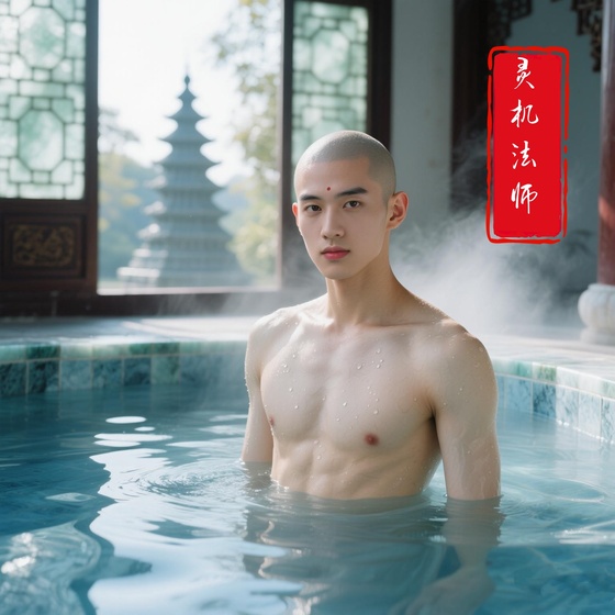 依旧一袭雪白袈裟的灵机法师头戴金顶毗卢帽,手持九环锡杖,绕汤苑三匝,手中以杨柳枝蘸七宝功德水点洒四方,诵《大悲咒》破秽。诵毕,灵机法师与西安府同知共执金剪,剪断了系匾红绸,露出圣僧亲笔题写“雁塔汤苑”草书四字匾额,匾上字内嵌金粉,阳光照射时金芒流转。